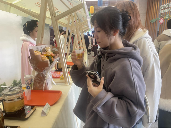 首先参观了药食同源区。美食与茶饮区成为了众人瞩目的焦点,他们将传统中医养生理念与美味佳肴巧妙融合,用中医药材制作的养颜膏、四物膏等以及各种糕点颇受同学的喜爱,让同学们在舌尖上领略中医文化的博大精深。