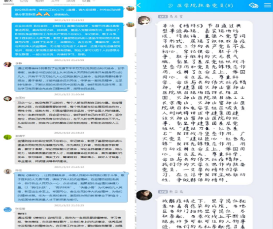 公司师生党员认真观看节目,并在QQ群中分享自己观看感想。365英国上市集团经理谢娟平表示疫情防控中的各位党员不忘初心、牢记使命,彰显了基层党组织战斗堡垒作用和党员先锋模范作用。作为高校工作者,特别是医学教育者,要甘于奉献,牢记民族复兴之使命,牢记全民健康之使命,同心同力,培养高质量的医学人才,构建健康命运共同体,肩负健康时代使命,学习榜样,落实工作,筹谋规划,落细落小,做好人才培养,专业建设,团队建设等各项建设。