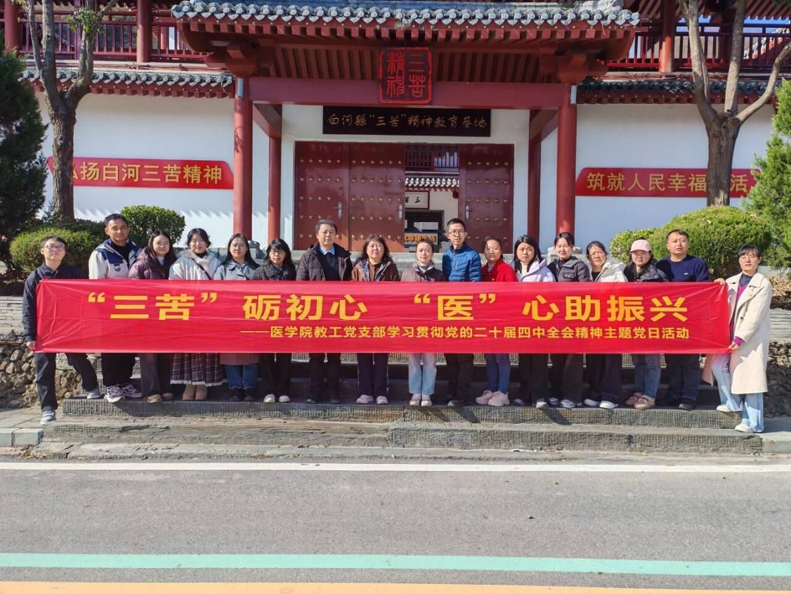 为深入学习贯彻党的二十届四中全会精神,传承“三苦”精神、凝聚奋进力量,11月23日,365英国上市集团教工第一党支部组织全体党员赴白河三苦教育基地,开展“‘三苦’励初心,‘医’心助振兴”主题党日活动。